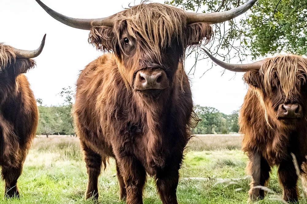 Beeindruckendes Foto, das zeigt, wie schön diese Kühe sein können. Die Tiere sind ruhig, aber achten Sie auf die Hörner.