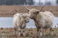 Schottische Highlander, Mutter und Kind, stehen liebevoll auf einer Insel im Wasser zusammen. Diese blonden schottischen Highlander stehen in einem Naturschutzgebiet, das von Natuurmonumenten verwaltet wird.