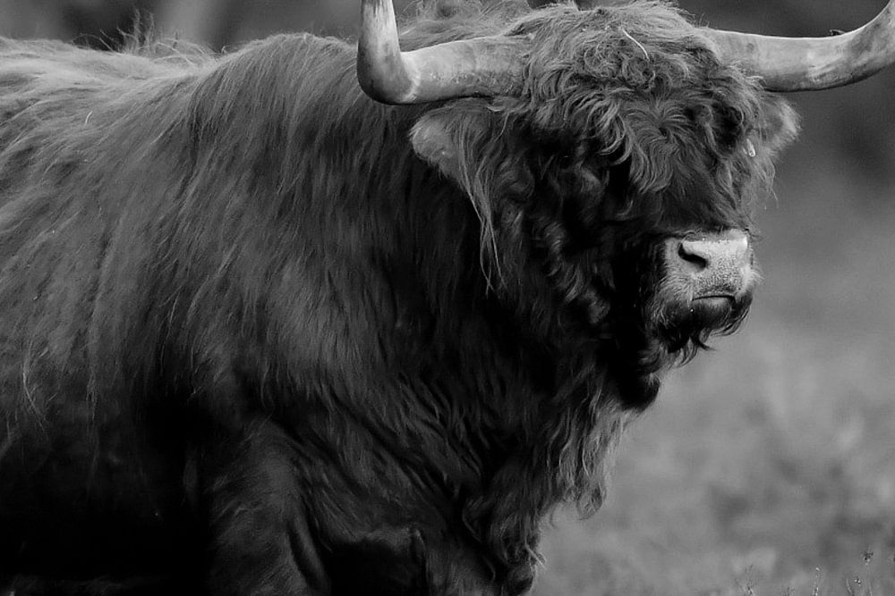 Schottischer Highlander in Schwarz und Weiß.