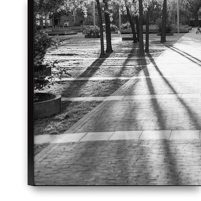 Bestelle das Foto Schwarz-Weiß-Fotografie des Hofgartens von Cortile, mit Gegenlicht und langen Schatten und einem spielenden Kind von Streets of Maastricht als Reproduktion auf Leinwand, Alu-Dibond, als Poster, Fototapete oder Acrylglasbild.