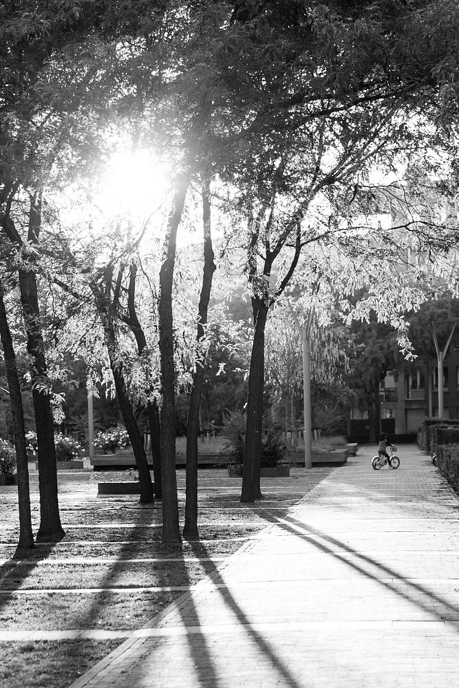 Schwarz-Weiß-Porträtfoto des Hofgartens von Cortile. Das Foto wurde an einem späten Herbstnachmittag mit Gegenlicht und langen Schatten aufgenommen. Im Hintergrund ist ein spielendes Kind zu sehen.