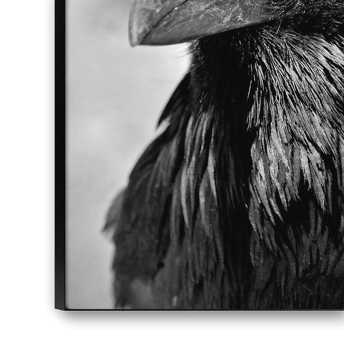 Ein schöner Rabe, der in die Kamera schaut. Eine schwarz-weiße Komposition, die das Gefieder dieses Vogels hervorhebt. Foto aufgenommen im Grand Canyon National Park, USA.