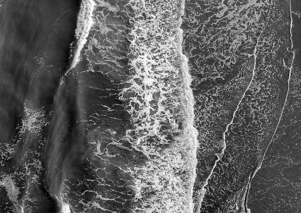 Aus der Luft mit einer Drohne aufgenommen, fängt dieses Foto die Küstenlinie in einer einzigartigen Perspektive ein. Es zeigt Ebbe und Flut als einen Tanz, eine kontinuierliche Bewegung der Natur. Wellen werden nicht einfach zu Wellen, sondern bilden nun eine rhythmische Komposition.