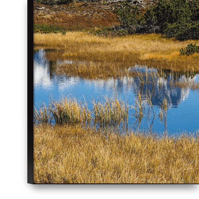 Die kleine Schwarze Lacke am Gerzkopf, eingebettet zwischen Schilf und Krabbelkiefern, spiegelt die Gipfel des Dachsteinmassivs wider. Auf den Gipfeln liegt bereits etwas Schnee, und die Vegetation zeigt, dass es Herbst ist.