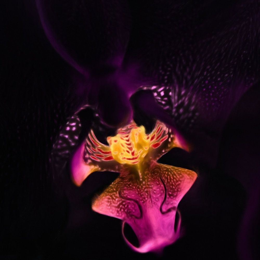 Schwarze Orchidee abstrakte digitale Gouache Stillleben Malerei in Farben schwarz lila, rosa und gelb