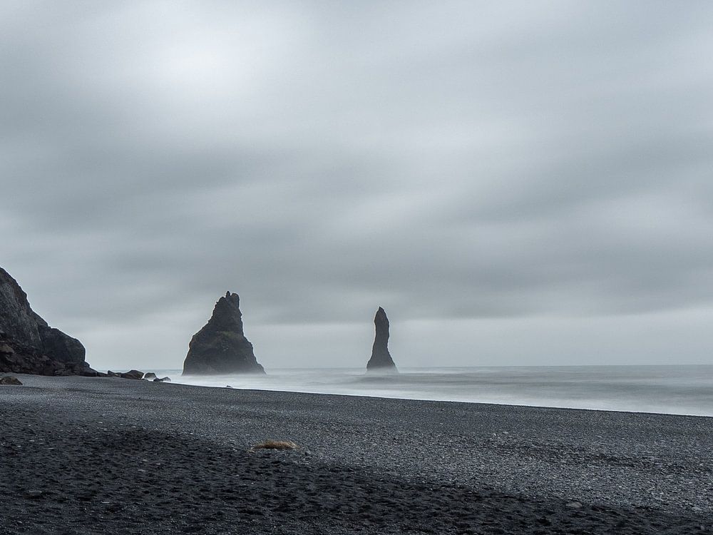 Dunkle Wolken über dem Atlantischen Ozean und dem schwarzen Strand von Vík in Island. Reynisdrangar ist ein Basaltfelsen, der sich unter dem Berg Reynisfjall in der Nähe des Dorfes Vík í Mýrdal an der Küste im Süden Islands befindet. Es ist umgeben von einem schwarzen Sandstrand, der zu einem der zehn schönsten nicht-tropischen Strände der Welt gewählt wurde.