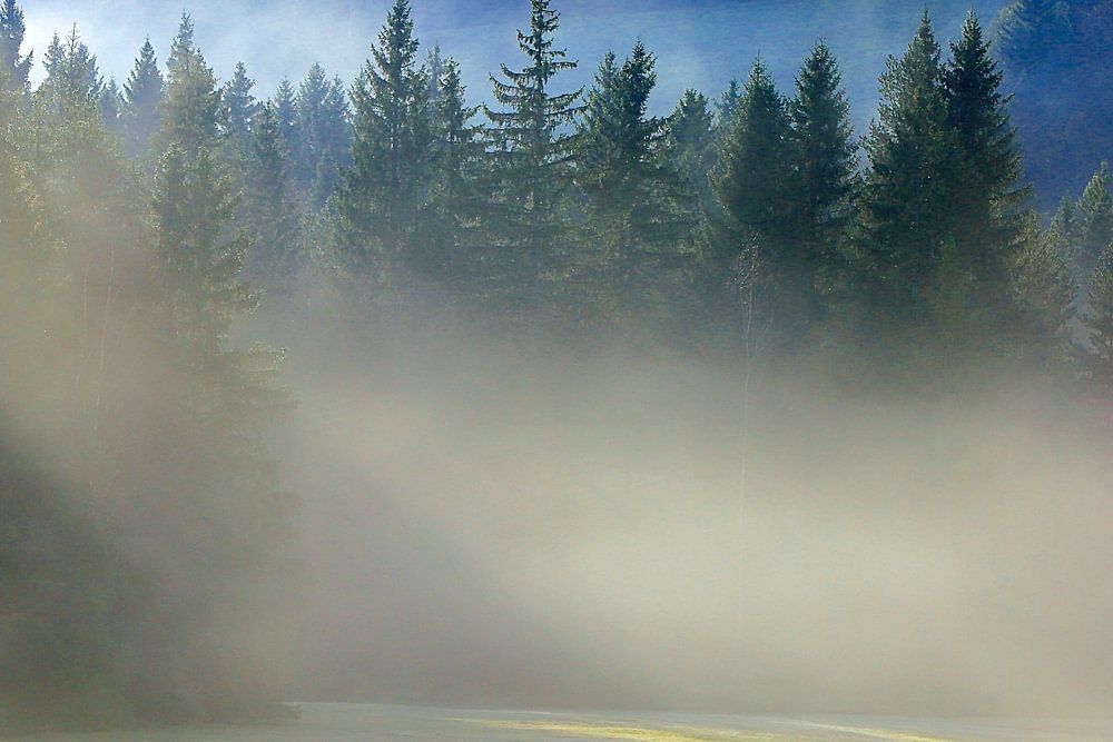 Nebelschwaden ziehen an einem sonnigen Herbstmorgen im November durch den Schwarzwald.