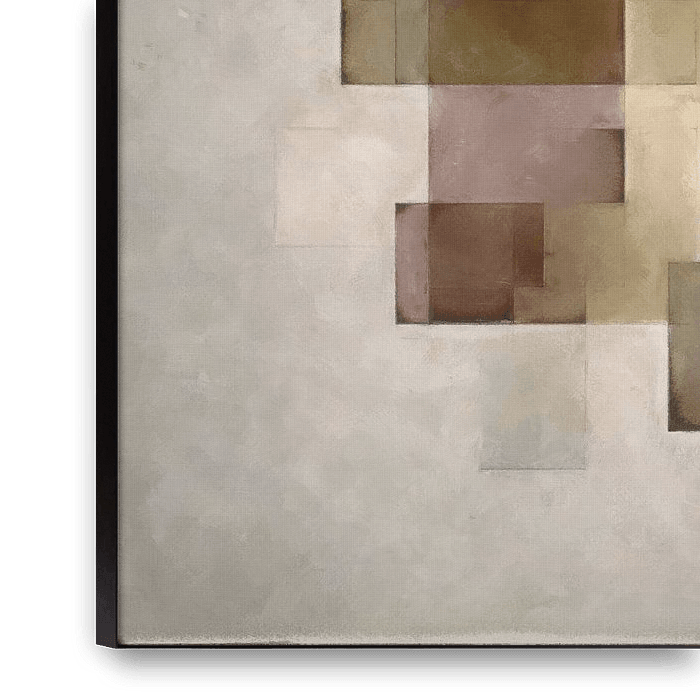 Dieses Werk überlagert spielerisch transparente Quadrate und Rechtecke in sanften Tönen - Beige, Taupe, Altrosa und Olivgrün. Die Formen scheinen in der Mitte eines hellen, fast weißen Hintergrunds zu schweben, was dem Ganzen einen luftigen und offenen Charakter verleiht.