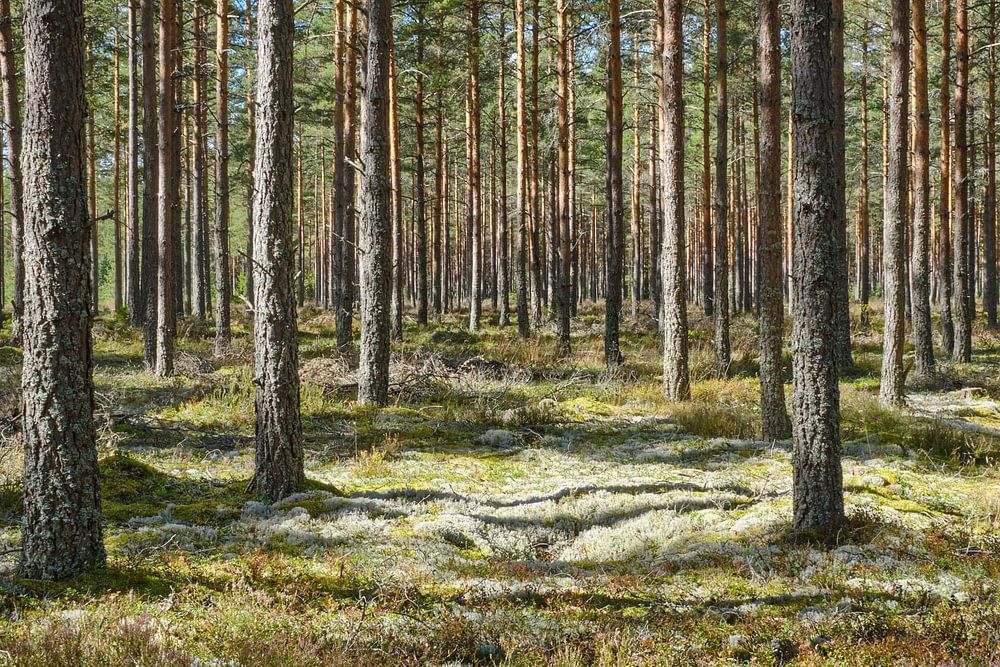 Schwedischer Kiefernwald im Herbst mit Moos und Preiselbeersträuchern