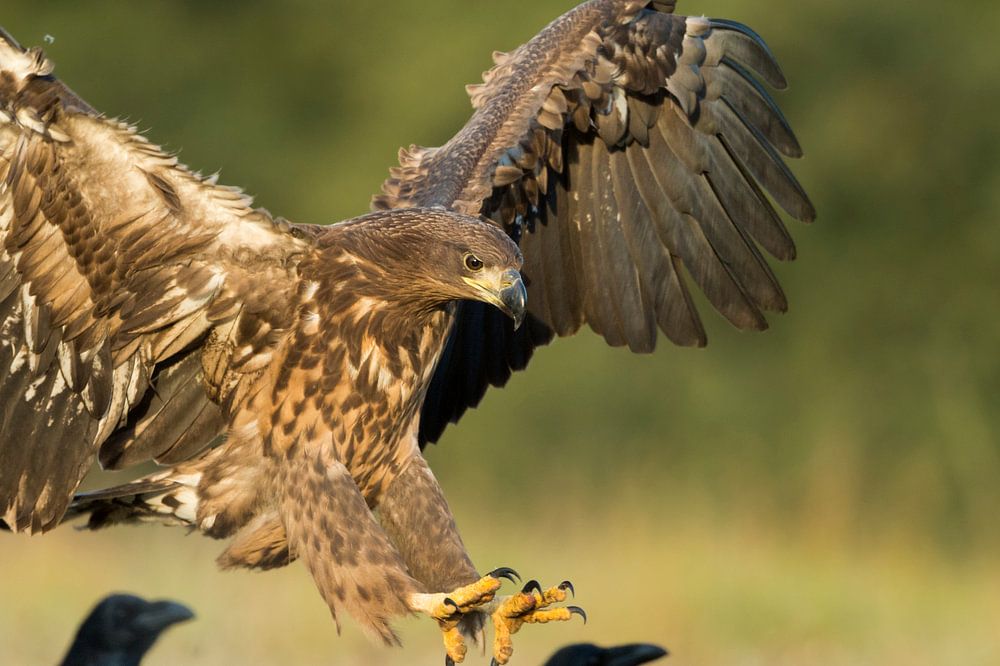 Seeadler ( Haliaeetus albicilla ) halbstarker Jungvogel, landet im schönsten Morgenlicht neben ein paar Kolkraben auf einer Wiese, wildlife, Europa