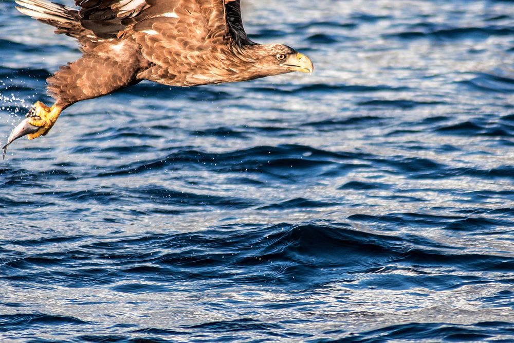Seeadler mit fangfrischem Fisch in den Krallen. Leckerer Snack.