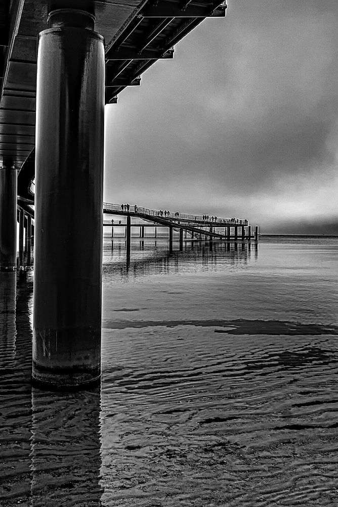 Die Maritim Seebrücke reicht rund 250 Meter in die Ostsee und bietet dabei einen Rundweg von 427 Meter Länge über dem Meer. In der Draufsicht kann ihre Form mit der einer ausgeworfe-nen Schlinge beschrieben werden. Der Stahlhohlkasten überspannt 23 Brückenfelder mit Re-gelspannweiten von 20 Metern und ist schließlich in einem unter dem Brückenvorplatz gelege-nen Widerlager aus Stahlbeton eingespannt. Das mit Sand überschüttete und nicht mehr ein-sehbare Widerlager ist auf acht Stahlrammpfählen tiefgegründet und ermöglicht aufgrund seiner Steifigkeit einen fugen- und übergangskonstruktionslosen Brückenzugang. Die gesamte mit bis zu acht Zentimeter dicken Bongossi-Holzbohlen ausgelegte und begehbare Fläche der Brücke beträgt 1.863 m² (ohne Anleger und deren Zugangsrampen).[1] Die Brücke besitzt zwei etwa 20 Meter lange Anleger, einen für die lokale Bäderschifffahrt und einen für Sportboote.
