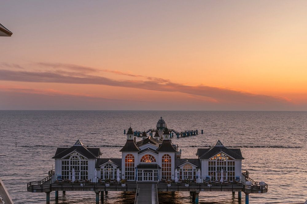 Seebrücke am Strand von Sellin bei Sonnenaufgang