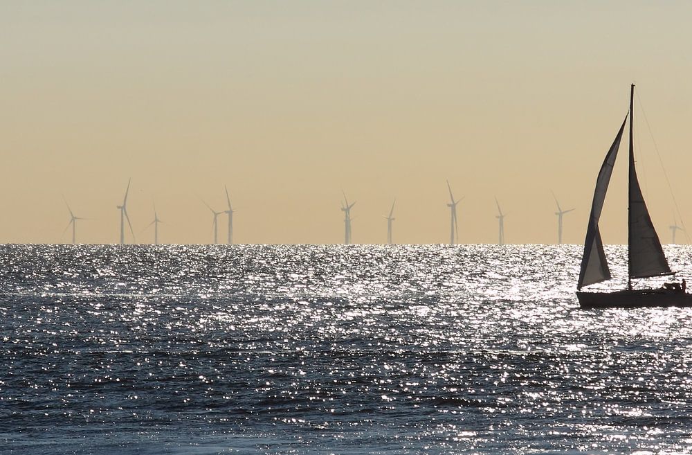 Während des Sonnenuntergangs passierte dieses Segelboot die Küste von Zoutelande über die Nordsee. Am Horizont sind die Windmühlen am Oosterscheldekering zu sehen.