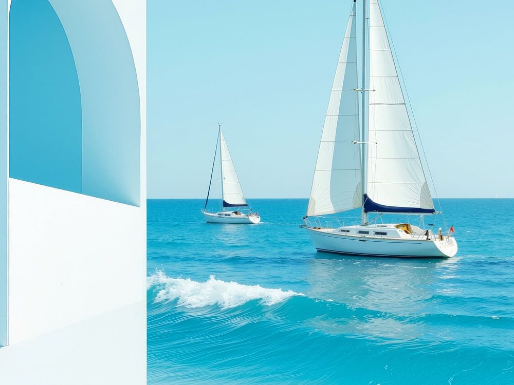 Dieses Bild öffnet einen imaginären Blick auf das Meer: Segelboote gleiten über die Wellen, gerahmt von klaren, geometrischen Formen in Weiß und Blau. Die Komposition verbindet maritime Dynamik mit architektonischer Strenge und erzeugt eine surreale Bühne, in der Natur und Konstruktion miteinander verschmelzen. Die Farbpalette – von kühlem Türkis bis zu strahlendem Weiß – verstärkt die meditative Klarheit des Bildes.