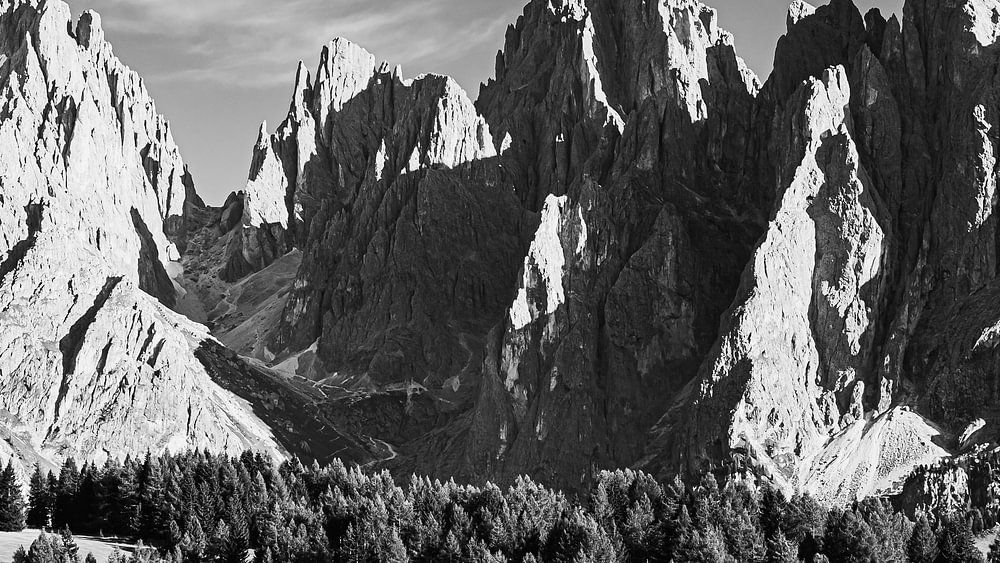 Ein 16:9-Foto in Schwarz-Weiß von einem Abend auf der Seiser Alm, einem Hochplateau der Dolomiten und der größten Hochalm in Europa.