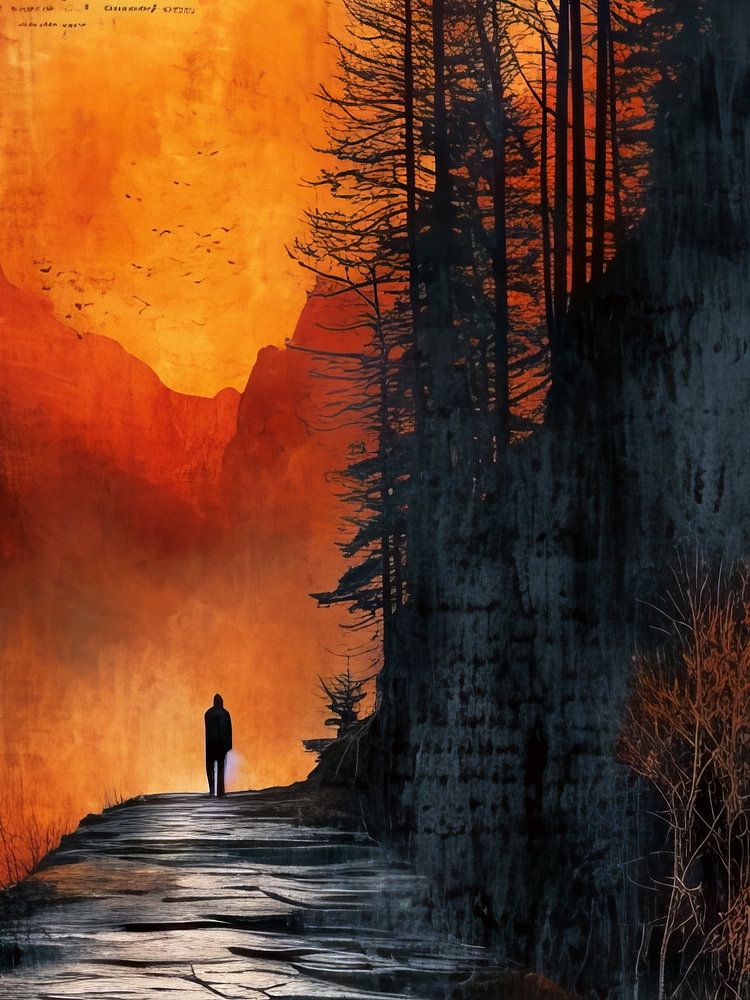 Das Werk zeigt eine Szene mit einem starken Kontrast zwischen zwei verschiedenen Welten. Im Vordergrund ist ein steiniger Weg zu sehen, der in das Bild hineinführt. Auf diesem Weg steht eine Figur mit einer Taschenlampe, die in die Ferne blickt. Die Bildmitte ist durch einen großen kreisförmigen Ausschnitt gekennzeichnet, der den Blick in eine andere Welt freigibt - eine Welt, die von einem leuchtenden, warmen Orange erfüllt ist, das an den Himmel eines Sonnenuntergangs erinnert. Innerhalb dieses Kreises sind Silhouetten von Bäumen und Bergen zu erkennen, die einen starken Kontrast zum dunklen Vordergrund bilden. Der Hintergrund des Bildes ist mit Schriftzeichen bedeckt, die an ein Manuskript erinnern und der Komposition eine texturierte Dimension verleihen.