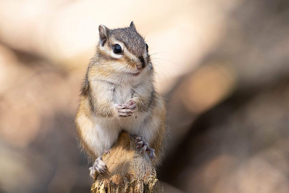 Ein sibirisches Streifenhörnchen (Eutamias sibiricus) in einem Wald in Tilburg Noord Brabant in den Niederlanden