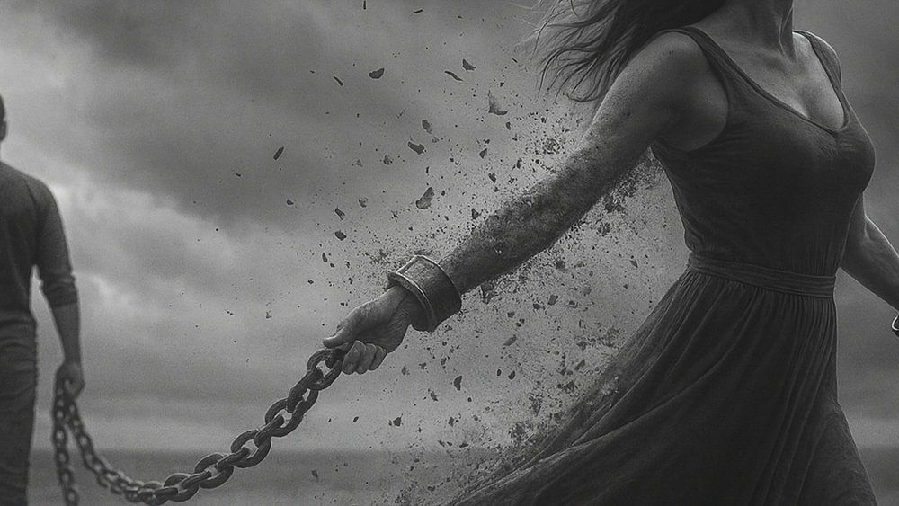 Dieses eindringliche Schwarz-Weiß-Kunstwerk zeigt eine Frau, die die Ketten eines Mannes sprengt, während sie kraftvoll vorwärts schreitet, wobei ihre Haltung durch den Wind, der sie umspielt, noch verstärkt wird. Die Skulptur symbolisiert Freiheit, Loslassen und den Mut, einen neuen Weg zu gehen. Die dramatische Beleuchtung und die fließende Bewegung in der Komposition verleihen diesem Werk eine fast filmische Intensität und machen es zu mehr als nur einer Fotografie - es ist eine in Bildern festgehaltene Geschichte.