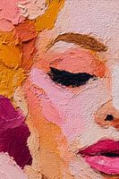 Ein ausdrucksstarkes, malerisches Porträt in warmen Korallen-, Rosa- und Goldtönen. Die grobe Farbstruktur verleiht dem Werk eine greifbare, fast skulpturale Qualität. Das halb geschlossene Auge und die weichen Lippen schaffen einen Moment der Ruhe und Selbstbeobachtung. Dieses Kunstwerk strahlt zugleich weibliche Kraft und Sanftheit…