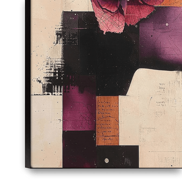 Die Mischung aus geometrischen Formen, Papierschichten und Pinselstrichen in warmen Pflaumen-, Kupfer- und Beigetönen verleiht diesem Werk einen modernen, raffinierten Look. Die Blume symbolisiert Wachstum und Verletzlichkeit, während der ruhige Blick für…