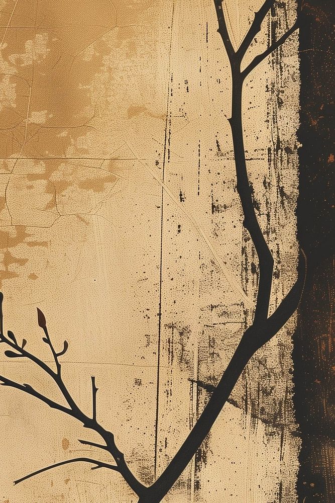 Silhouettierter, nach oben wachsender Zweig vor einem verwitterten Hintergrund in warmen, erdigen Beige- und Orangetönen (Farbe). Der Zweig, der mit seinen kahlen Knospen nach oben zu streben scheint, steht in scharfem Kontrast zu den tieferen, dunkleren Tönen auf der rechten Seite der Komposition, wo Schwarz und Braun die Stimmung dominieren. Die verwitterte, raue Textur des Hintergrunds sieht fast wie altes Pergament oder eine verwitterte Wand aus, was das Gefühl von vergehender Zeit und Vergänglichkeit noch verstärkt.