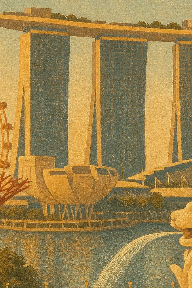 Ein faszinierendes Panorama von Singapore entfaltet sich, geprägt von futuristischen Skylines und dem ikonischen Merlion. Die Harmonie von Natur und Architektur, symbolisiert durch den riesigen Baumwasserturm, vermittelt ein Gefühl von Abenteuer und Entdeckung. Ideal für das Wohnzimmer, bringt es Fernweh und urbane Eleganz in jeden Raum.