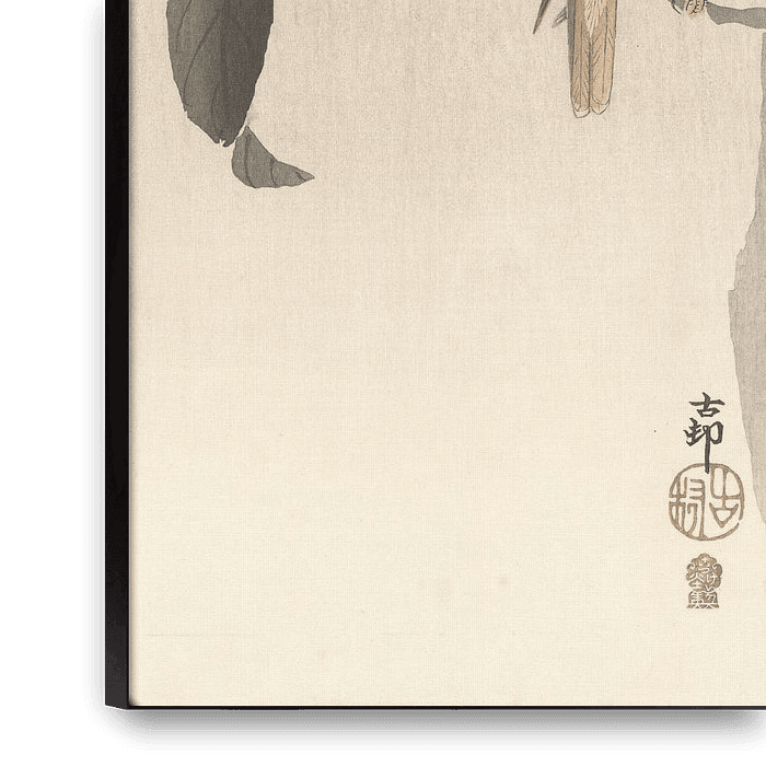 Bestelle Singvogel und blühende Kamelie als Reproduktion auf Leinwand, Alu-Dibond, als Poster, Fototapete oder Acrylglasbild.