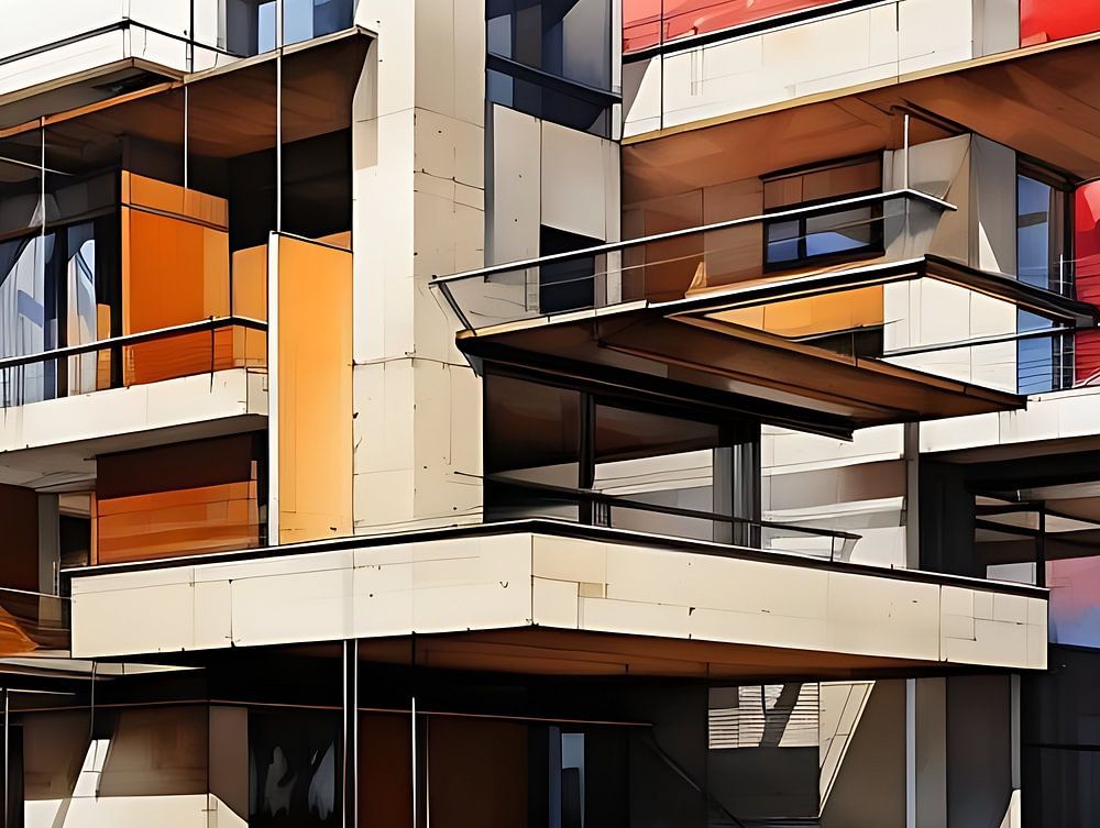 Diese mit A.I. erstellte Architekturskizze ist eine abstrakte Darstellung eines modernen Gebäudes, die farbenfroh ausgefüllt ist und eine schöne Ergänzung an der Wand darstellt.