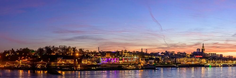 Skyline der Stadt Nijmegen am Ufer der Waal von der Waalbrug aus gesehen während des Sonnenuntergangs. Verschiedene Schiffe passieren den Fluss während dieses schönen kalten Wintersonnenuntergangs während der blauen Stunde am Ende des Tages.