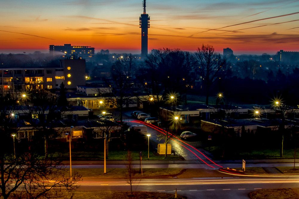 Skyline von Roosendaal mit Fernsehturm, aufgenommen während der blauen Stunde (Sonnenaufgang).