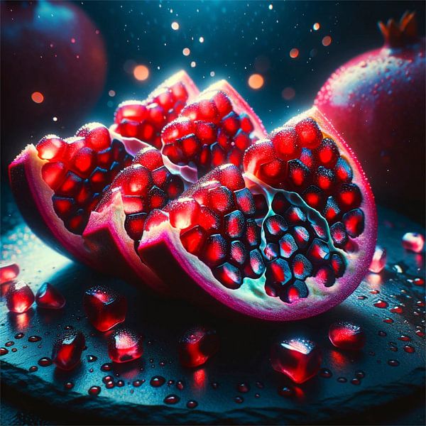 In "Sliced Pomegranate" verschmelzen die Grenzen zwischen Surrealität und Realität, und die Frucht wird zum Medium einer tieferen Auseinandersetzung mit Form, Farbe und Textur in der Welt der modernen Kunst. Es ist eine Einladung, die vielschichtige Schönheit der Natur zu erkennen und zu bewundern.