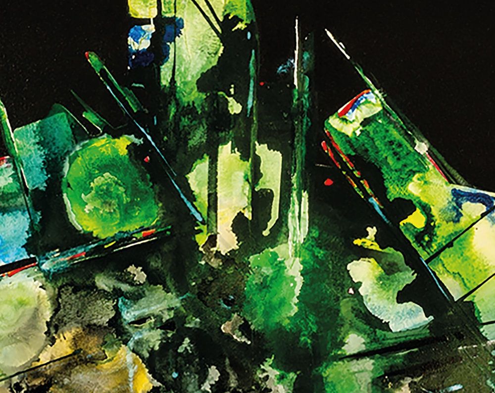 Bw. Nessel auf Keilrahmen mit schwarzem Gesso grundiert, farbige Tusche, weiße Untermalung und Acrylfirnis