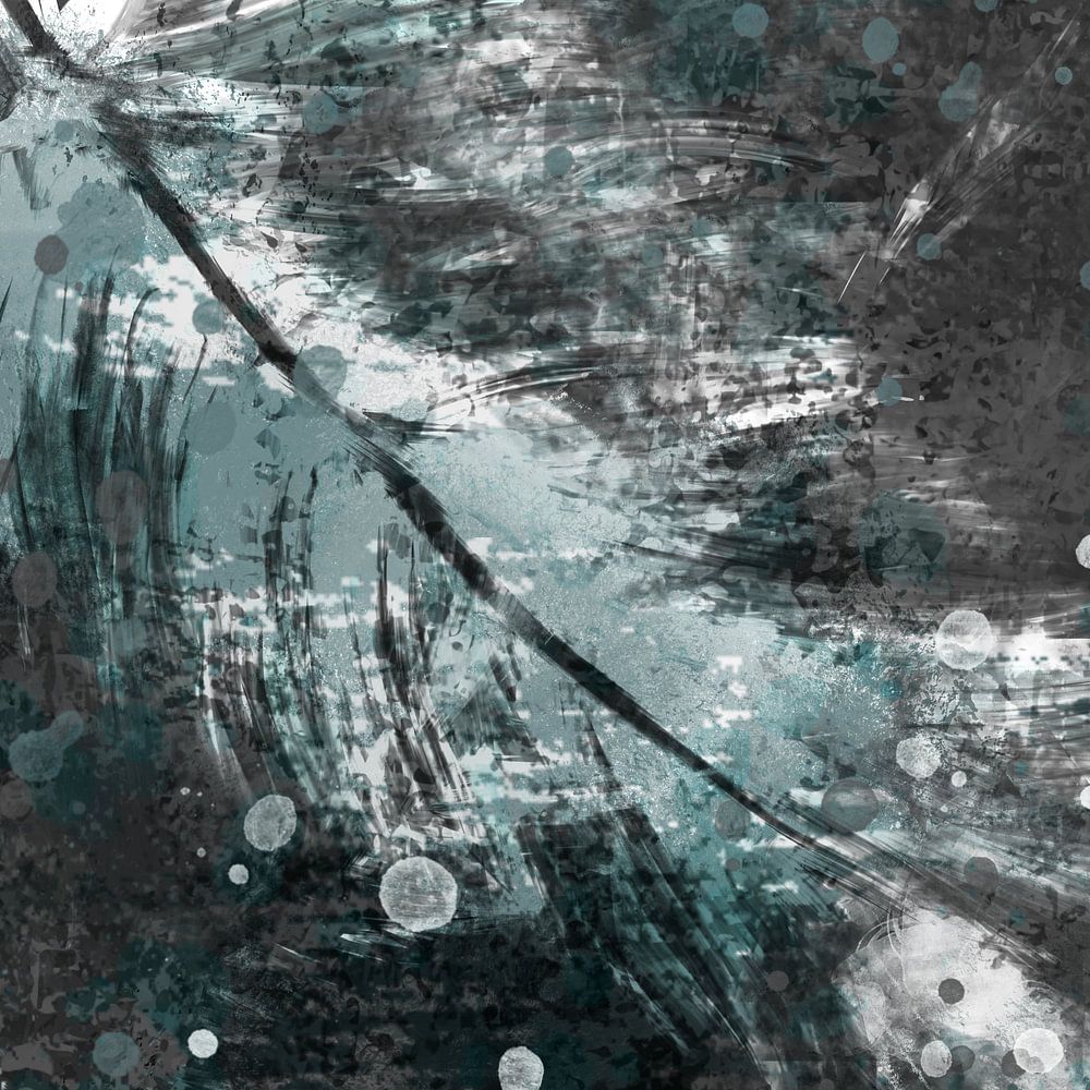 Weichheit und Rauheit kombiniert in einem Kunstwerk. Dunkelgrauer Hintergrund mit steiniger Textur. Im Vordergrund eine weiße Daunenfeder mit blauer Tönung.