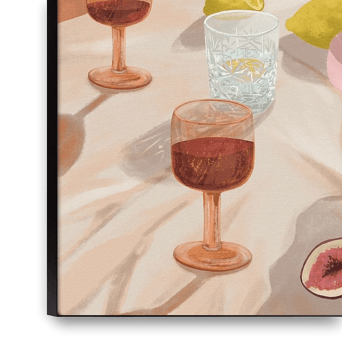 Herrliche Spätsommeratmosphäre auf dieser Illustration eines gedeckten Tisches mit einer Blumenvase, Weingläsern, Feigen und Zitronen. Hier wurde vor allem gutes Essen serviert und es wurden Geschichten zwischen Freunden ausgetauscht. Aber. wer macht den Abwasch?