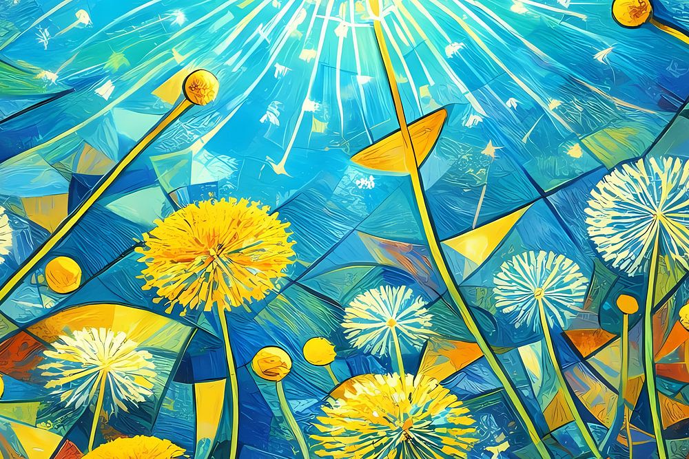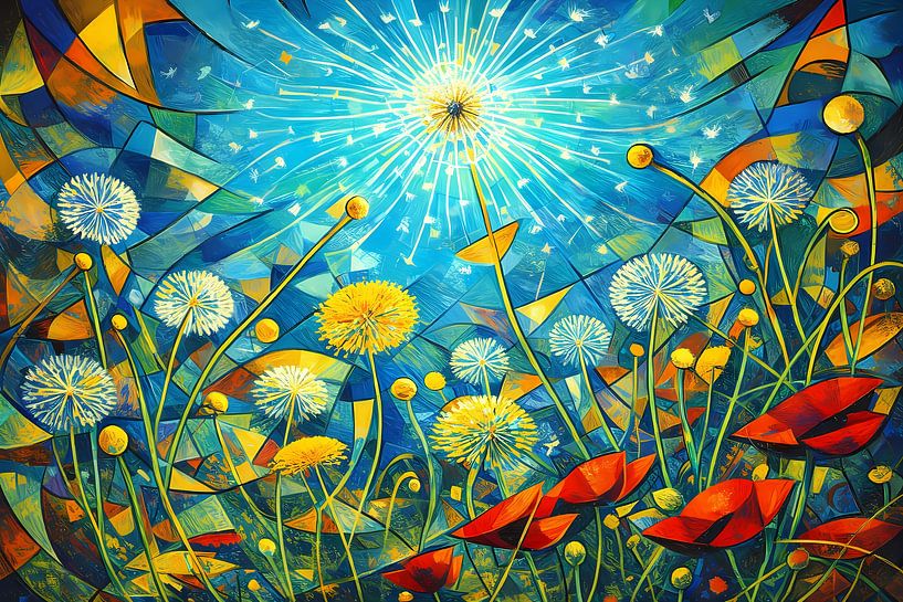 Eine lebhafte Szene, die einen abstrakten Garten mit Löwenzahn und Mohnblumen zeigt. Der Himmel erstrahlt in leuchtenden Blautönen und verbreitet Licht über die Pflanzenwelt.