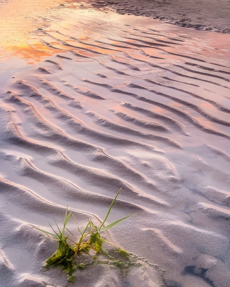 Feine Texturen zeichnen den Strand von Terschelling. Die Sonne ist hinter den Wolken verschwunden und bringt den Himmel zum Glühen. Das niedrige Wasser bahnt sich seinen Weg zum Meer. Ein Grasbüschel beginnt zu wachsen.