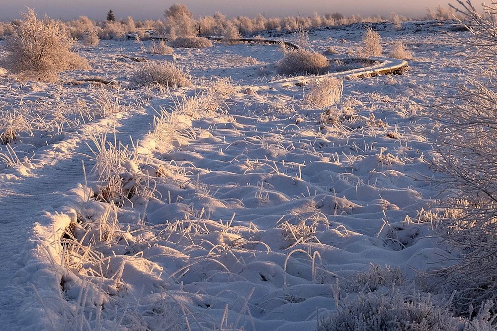 Sonnenaufgang an einem kalten Morgen im Hohen Venn in Belgien im Winter.