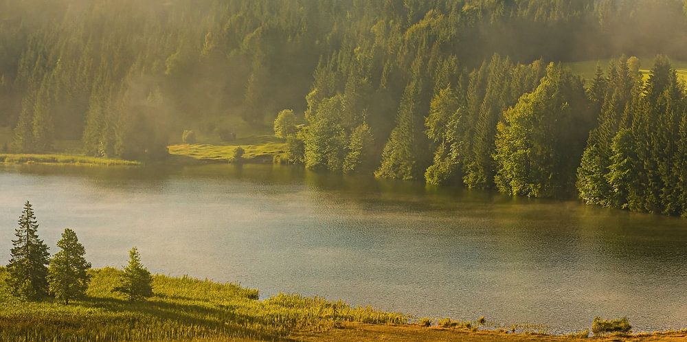 Sonnenaufgang und Morgennebel am Geroldsee mit dem Karwendelgebirge im Hintergrund. Der Geroldsee (offizieller Name Wagenbrüchsee) liegt zwischen Garmisch-Partenkirchen und Mittenwald im Bundesland Bayern, im Süden Deutschlands.