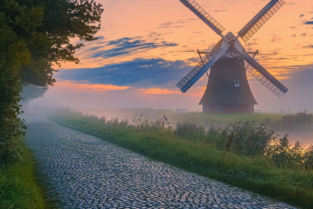 Ein horizontales Foto eines schönen Sommermorgens mit einer Nebelschicht während des Sonnenaufgangs an der Krimstermolen, die sich am Boterdiep im Dorf Zuidwolde in der Provinz Groningen befindet.