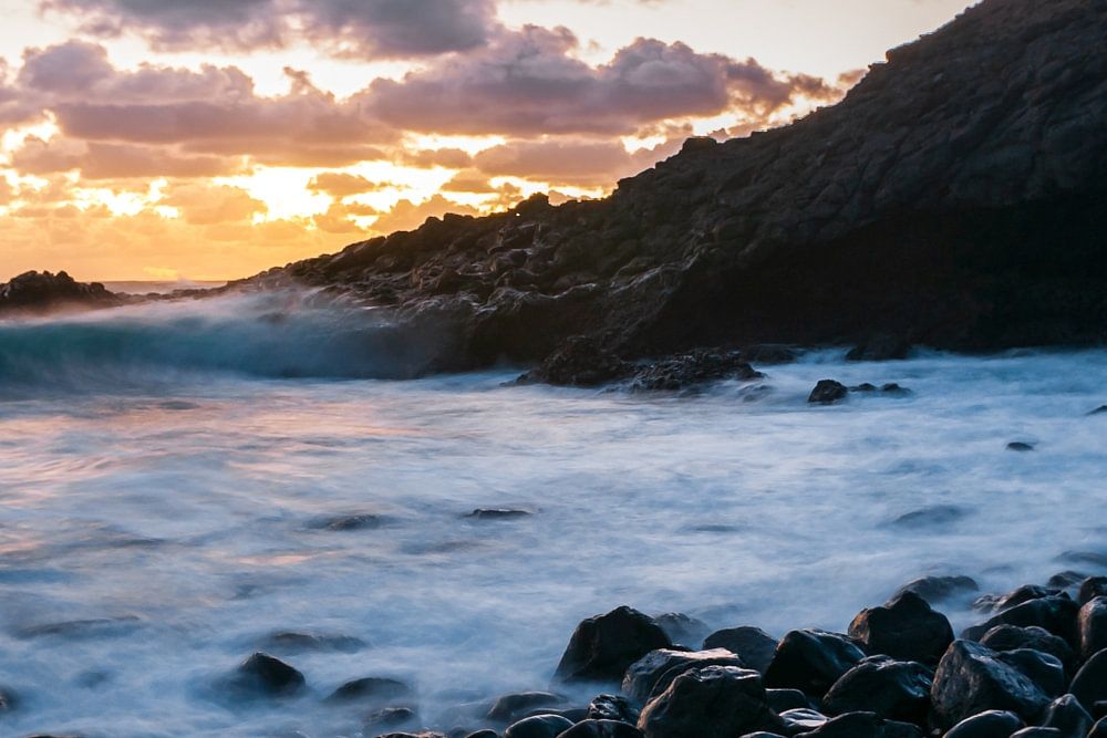 Eine Sonnenaufgangsaufnahme an der Küste von Gran Canaria, Spanien. Wellen, die sich an den Felsen entlang bewegen.