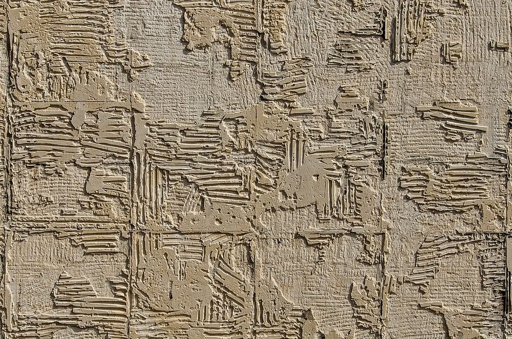 Die Fliesen an der Fassade, etwa 25 mal 25 Zentimeter groß, waren entfernt worden, vermutlich abgeplatzt. Zurück blieben Leimreste oder Mörtel, oder was auch immer damals verwendet wurde. Mit einem faszinierenden, eher zufälligen Muster aus Streifen und Flächen. Aber auch diese Schicht ist bereits teilweise verschwunden.