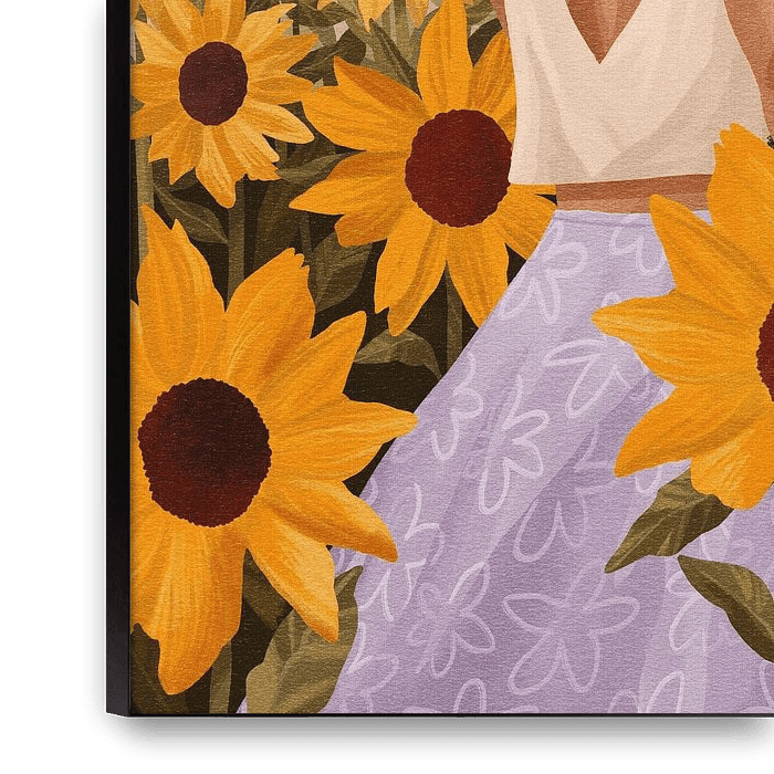 Romantische Illustration einer Frau in einem fliederfarbenen Rock inmitten von Sonnenuntergangssonnenblumen. Ein Sommerabend voller Duft und Farbe.