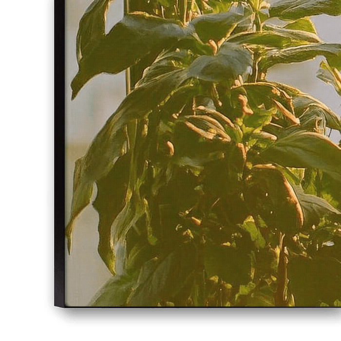 Goldene Sonnenstrahlen durchfluten den Raum und zaubern eine warme Atmosphäre, während eine entspannte Person zwischen üppigen Pflanzen sitzt. Ihr Lächeln strahlt Ruhe und Zufriedenheit aus, perfekt für das Wohnzimmer, wo Gemütlichkeit und Lebensfreude im Vordergrund stehen. Diese Szene lädt zum Verweilen und Träumen ein.