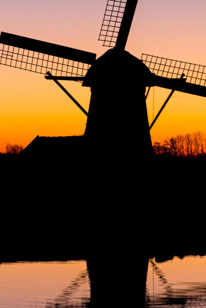 Sonnenuntergang - Mühle in Silhouette auf dem Ringkanal des Haarlemmermeeres gegen einen blauen und orangen Himmel
