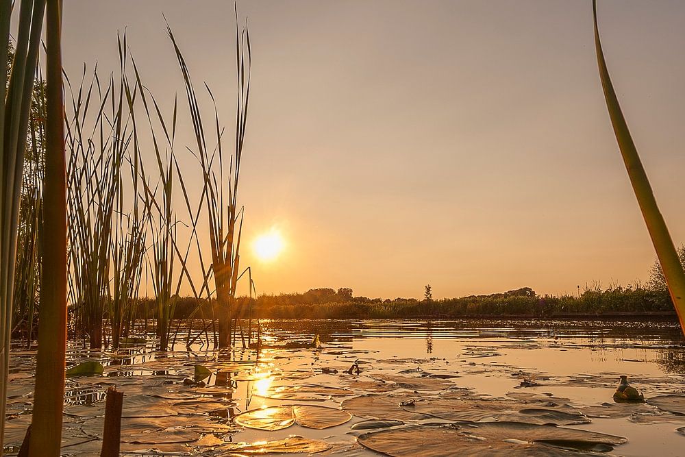 Foto eines Sonnenuntergangs, aufgenommen von einem Boot auf der Linge in Gellicum an einem Sommerabend