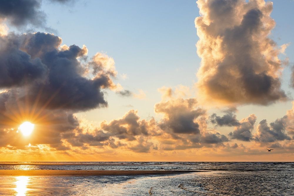 Die untergehende Sonne spiegelt sich im Wasser der Nordsee auf der ostfriesischen Insel Juist, Deutschland.