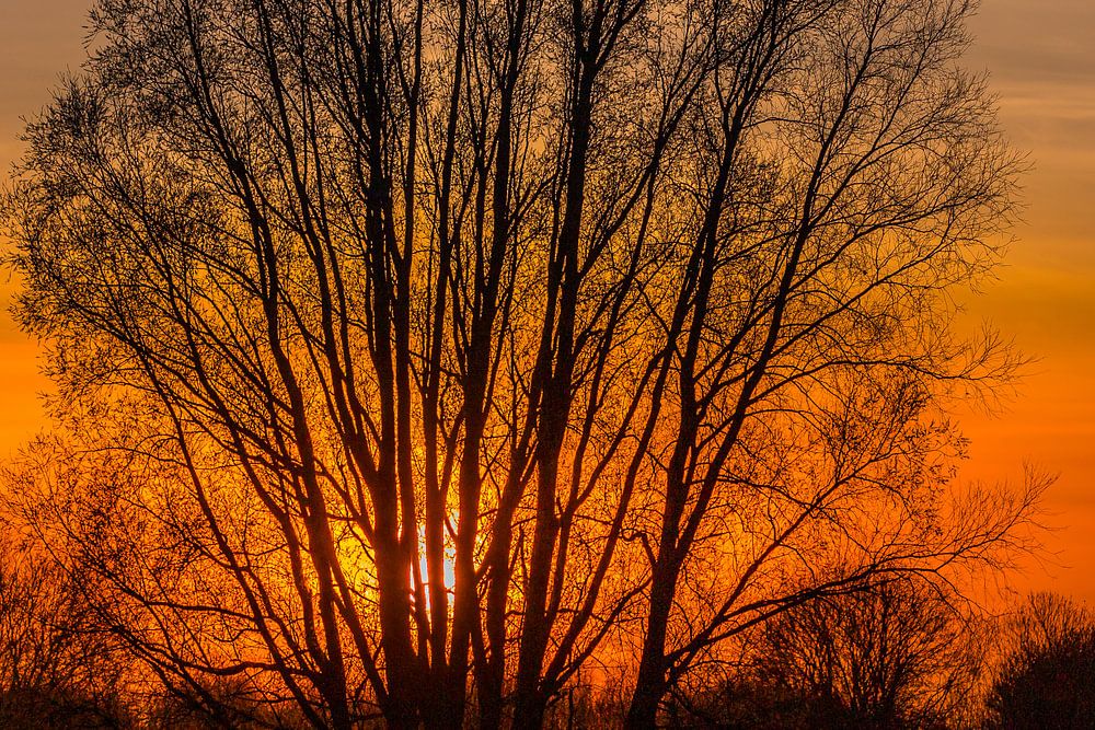 orangefarbener Sonnenuntergang hinter einer Baumsilhouette
