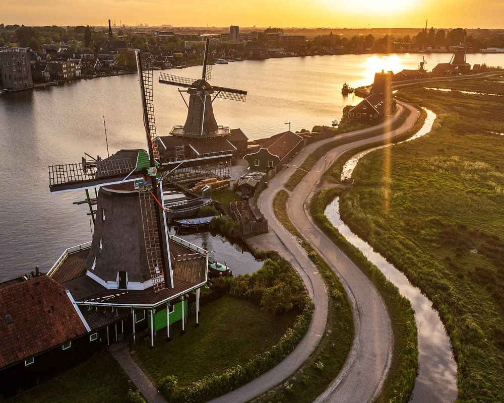 Dieses atemberaubende Foto zeigt die ikonischen Windmühlen von Zaanse Schans, die in das warme Licht des Sonnenuntergangs getaucht sind.