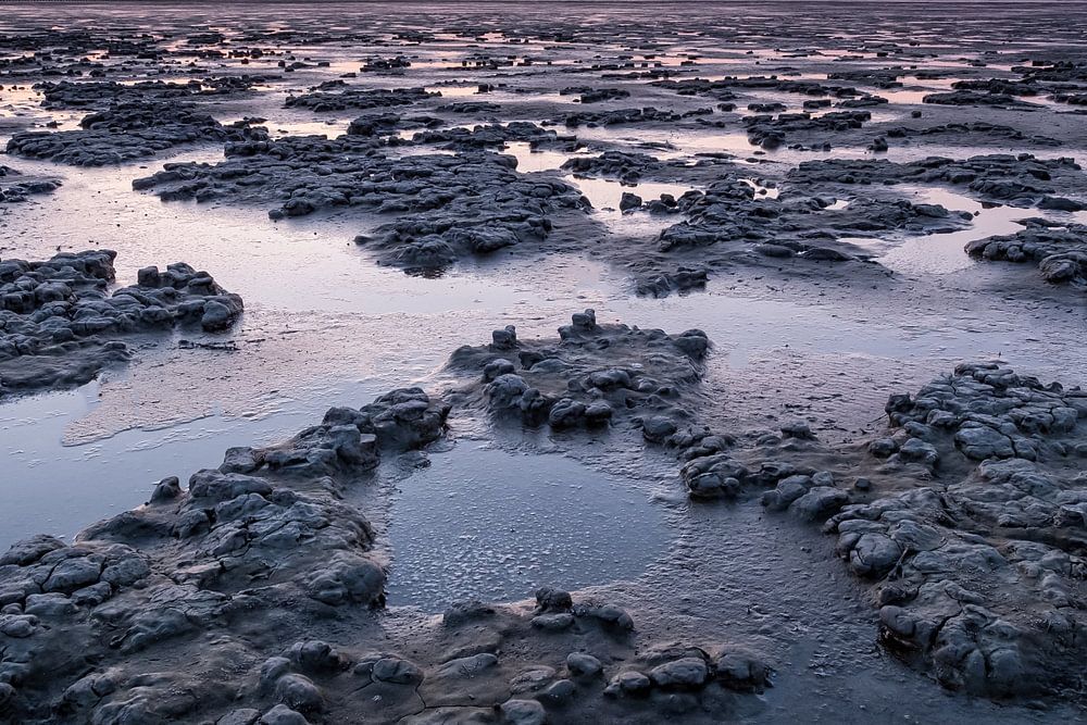Sonnenuntergang bei Ebbe über dem Wattenmeer in der Nähe des friesischen Dorfes Ternaard.